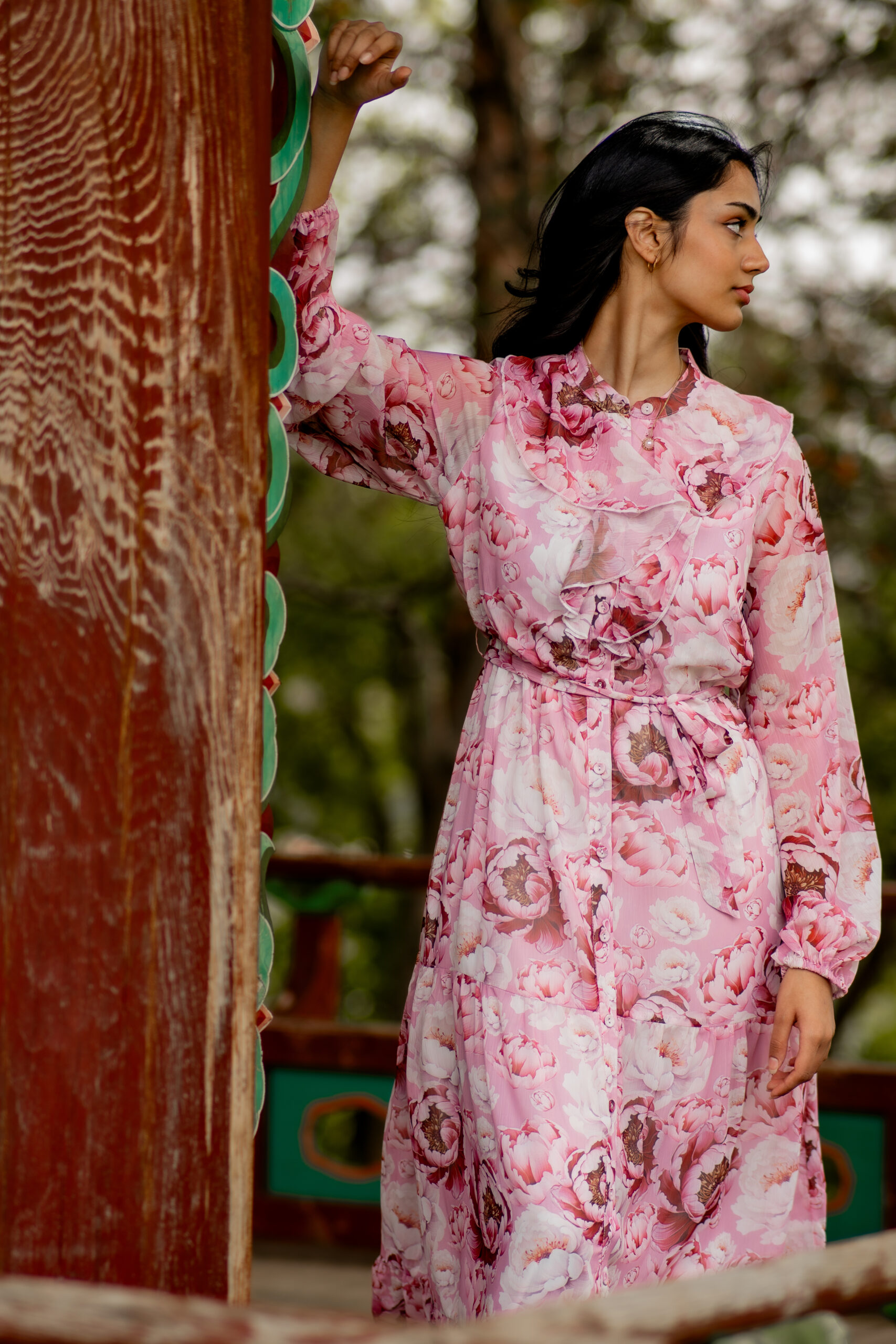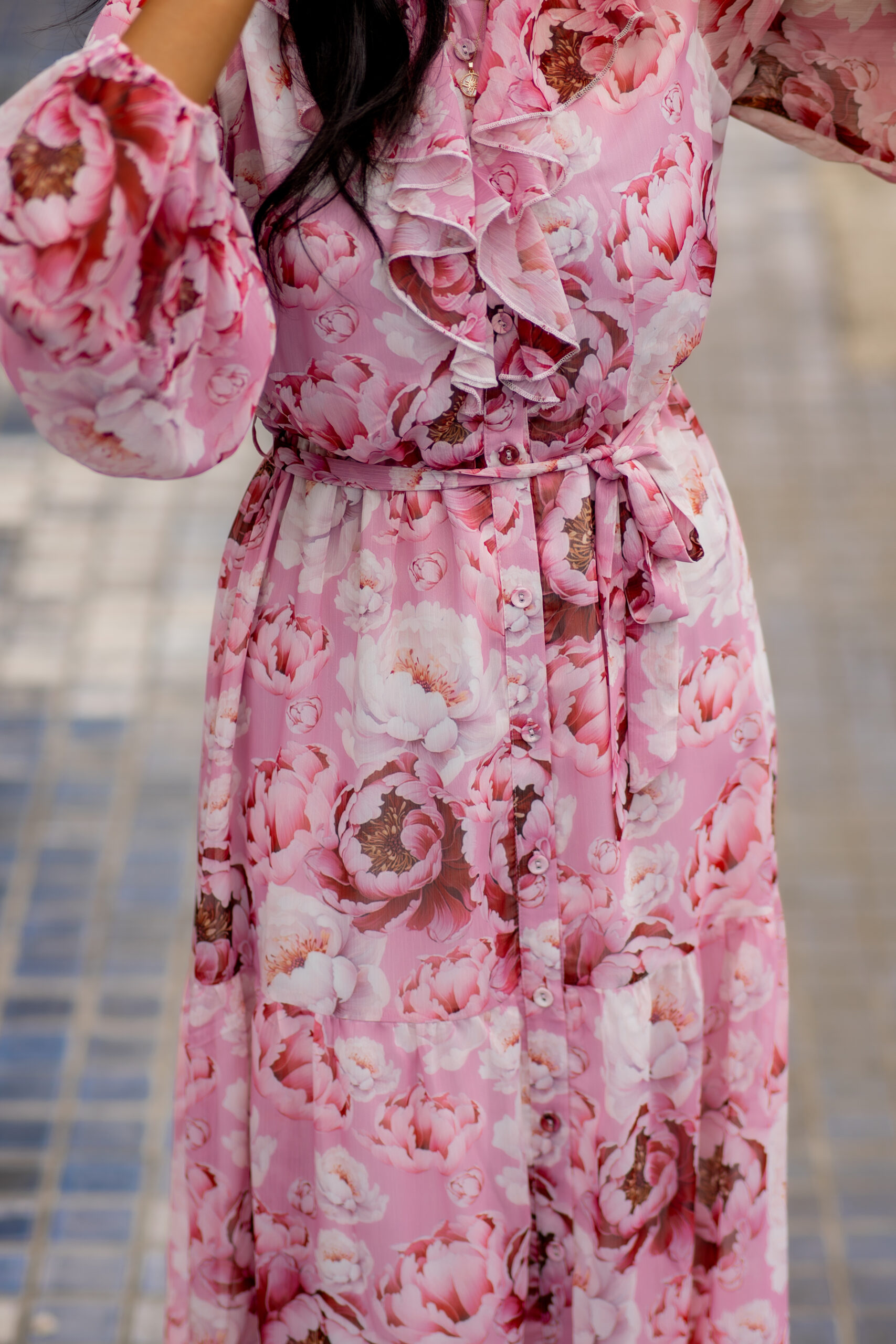 This luxurious yet modest dress combines elegance with comfort. Its lightweight, button-through design ensures ease of wear, while the tiered structure adds a stylish and sophisticated touch